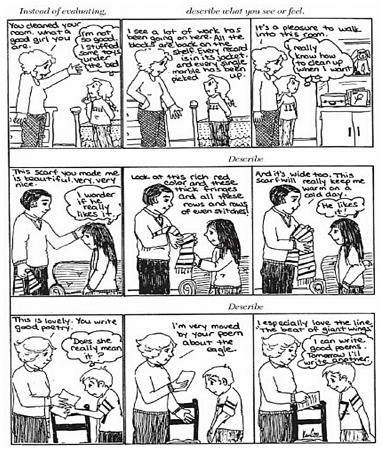 Instead of Evaluating (“Good” . . . “Great!” . . . “Fantastic!”), Describe: